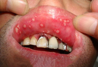 曹先生曾在多家大大小小的医院就诊,效果不佳,后经朋友介绍找到省内著名的口腔黏膜专家薛镇宇主任,经检查病人上嘴唇黏膜表层,可见十多个大小不一溃疡,大如蚕豆,小如绿豆,下唇内也有一毫米长陈旧性溃疡愈后瘢痕。