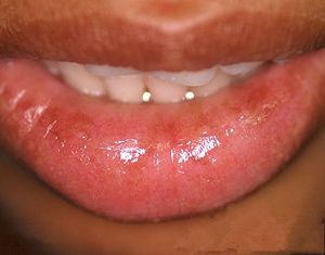 以侵犯下唇为主,多见于中老年人。开始在唇黏膜出现小水疱,很快破溃,结痂,若表面不糜烂,则可见境界清楚的局限性暗红色水肿性斑块,表面有涂漆样光泽。后期可能有粘膜的萎缩性改变。但易反复发作。