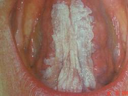 亦称颗粒-结节状白斑,口角区黏膜多见。损害常如三角形,底边位于口角;损害的色泽为红白间杂,红色区域为萎缩的赤斑;赤斑表面“点缀”着结节样或颗粒状白斑。本型白斑多数可以发现白色念珠菌感染。