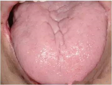 (图1 缺铁性贫血患者的舌黏膜表现)
