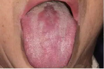 (图2 口腔念珠菌病感染,舌乳头萎缩或消失)