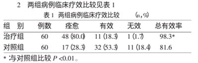2 两组病例临床疗效比较见表1